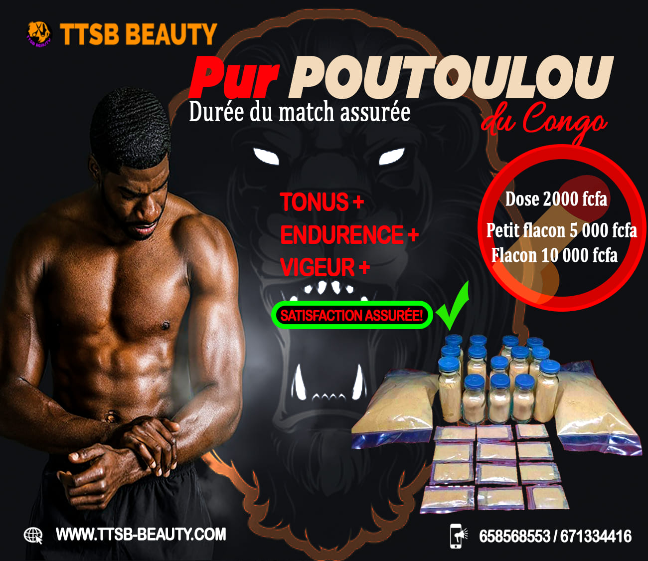 Vous avez ras le bol de decevoir votre compagne, votre fiancée, votre épouse, sur le plan sexuel? Vos parties de plaisir ne durent que quelques secondes ? Malgré vottre endurance, la taille de votre appareil sexuel ne vous permet pas de vous épanouir en couple? Aujourd’hui nous avons la solution pour vous, la solution à votre éjaculation précoce. Retrouvez votre endurance avec le poutoulou un aphrodisiaque 100% naturel. Surprenez votre conjointe avec une endurance élevée pour une éjaculation possible après une 1 heure au moins.